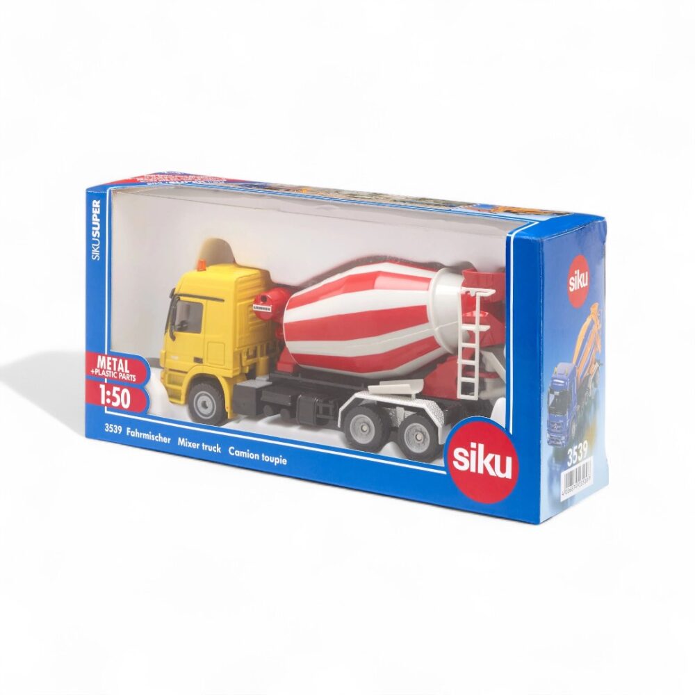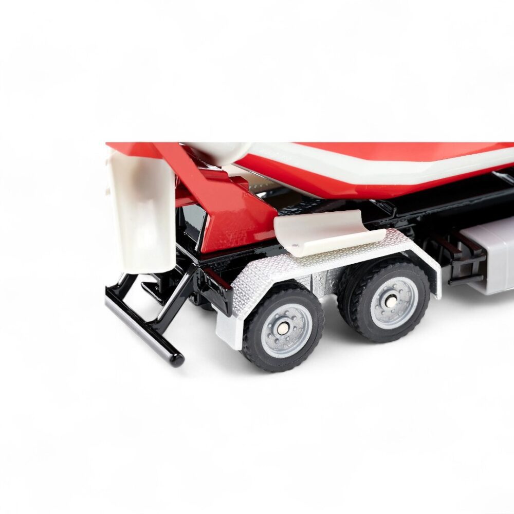Llevar el hormigón premezclado a la obra es tarea del camión hormigonera. El modelo 1:50 con carrocería Liebherr sobre chasis de 3 ejes y cabina Mercedes Actros realiza esta tarea sin problemas. El tambor es giratorio y tiene un llamativo diseño de rayas. El caño es giratorio y se puede ampliar mediante dos componentes suministrados.