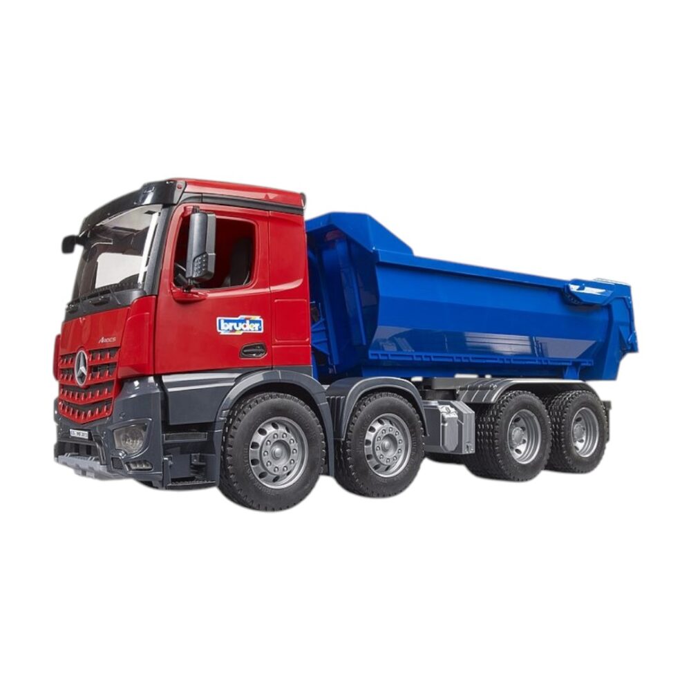 Potencia, durabilidad y eficiencia suelen ser elementos cruciales en una jornada laboral en carreteras y obras. Por eso, el nuevo Mercedes-Benz Arocs se ha desarrollado específicamente para estas necesidades. Su diseño también se ha revisado para adaptarse a estas características técnicas. Por ejemplo, la parte frontal de la parrilla del radiador tiene el aspecto típico del Arocs y refleja su enorme potencia. En este modelo, nos centramos en la durabilidad que caracteriza a los productos BRUDER y equipamos la cabina con una puerta abatible para que las figuras de juguete BRUDER puedan acceder al vehículo. Gracias a su forma especial de medio tubo, la carga se coloca automáticamente en el centro, lo que facilita al máximo la conducción y la descarga. El cilindro de triple extensión de la caja basculante y el portón trasero se pueden encajar en diferentes posiciones para permitir el máximo número de situaciones de juego. La cargadora articulada VOLVO (n.° de artículo 02458) y la gran pala mecánica Cat® (n.° de artículo 02483) combinan a la perfección con este impresionante camión basculante.