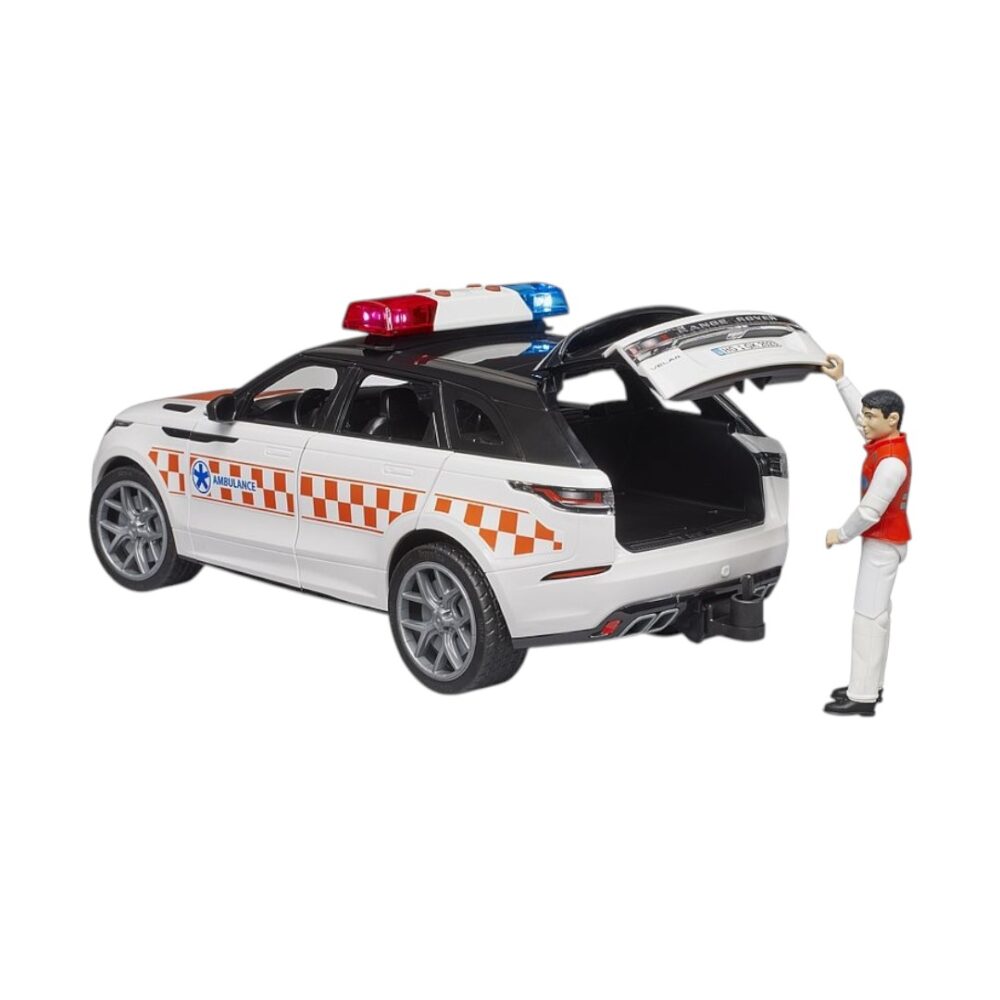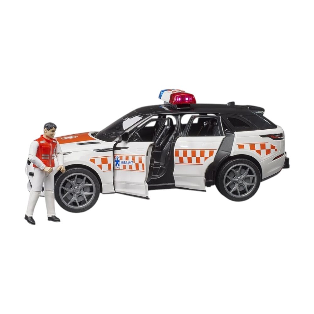 El Range Rover Velar, como vehículo médico de urgencias, complementa la ambulancia incluida en la gama BRUDER. El Velar transporta al médico de urgencias (incluido en el volumen de suministro) de forma segura al lugar del accidente. La extensión del volante se puede insertar a través de una trampilla de techo. Las cuatro puertas practicables y el portón trasero ofrecen espacio de almacenamiento. El Range Rover Velar es el complemento ideal para la ambulancia MB Sprinter (n.º de artículo 02676) y la unidad médica bworld (n.º de artículo 62711).