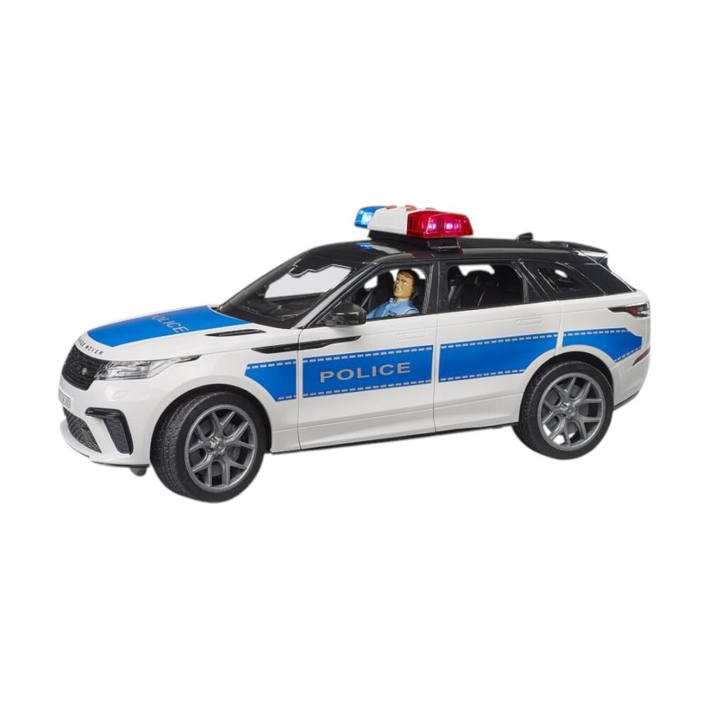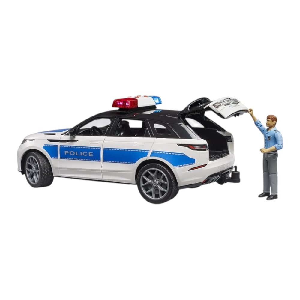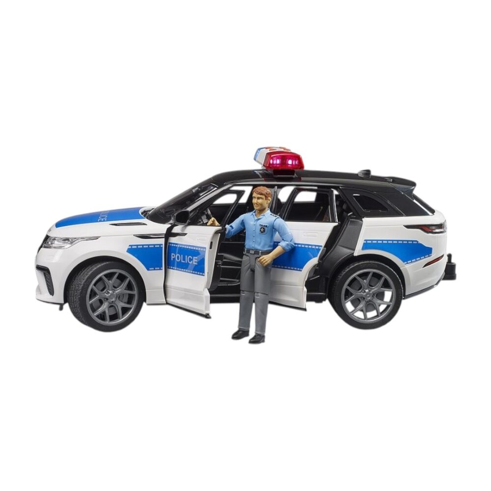 Los servicios de emergencia de BRUDER ahora también podrán patrullar terrenos de difícil acceso fuera de los límites urbanos gracias al Range Rover Velar con decoración policial. Al igual que el modelo real, el juguete cuenta con una cabina doble con cuatro puertas. Todas las puertas se abren para acomodar cuatro figuras de bworld. El eje delantero de este modelo a escala 1:16 se puede dirigir mediante la extensión del volante incluida. El portón trasero se abre para transportarlo durante el juego. El agente de policía incluido está excelentemente equipado y preparado para diversos despliegues. La comisaría de bworld (n.° de artículo 62732) y el Jeep Rubicon Unlimited como vehículo policial (n.° de artículo 02526) de la amplia gama de vehículos y figuras de servicios de emergencia son complementos especialmente adecuados.